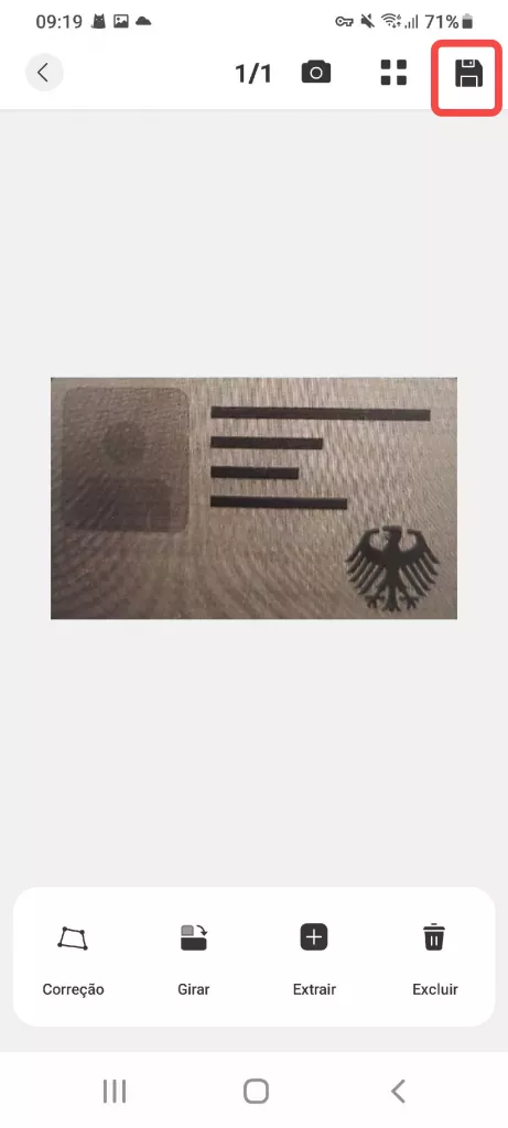 Passo 3. Após selecionar a digitalização, o UPDF detectará automaticamente o arquivo e cortará as margens extras para um resultado mais refinado. Depois, você pode usar as ferramentas na parte inferior para ajustá-lo manualmente. Essas ferramentas incluem "Correção", "Girar", "Extrair" e "Excluir".