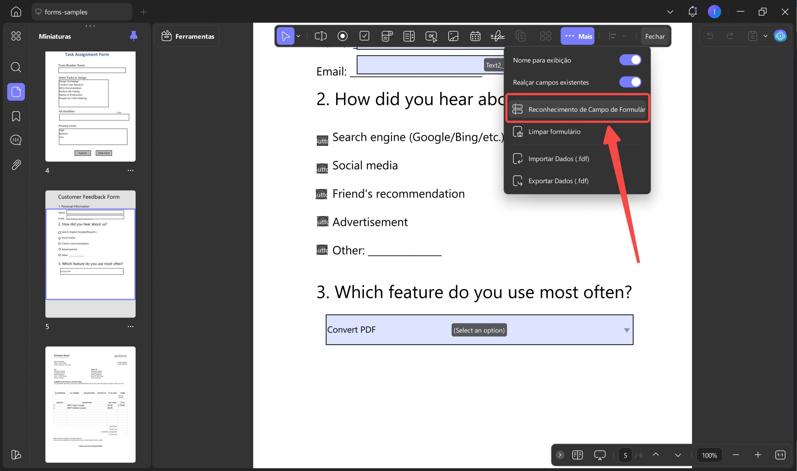 Se não conseguir preencher um formulário PDF, mude para o modo Formulário clicando em Ferramentas > Formulário > Mais. Certifique-se de que a opção Destacar Campos Existentes esteja ativada e clique em Reconhecimento de Campos do Formulário para detectar e ativar automaticamente os campos preenchíveis. Por fim, clique em Fechar para sair do modo Formulário e começar a preencher o formulário PDF.