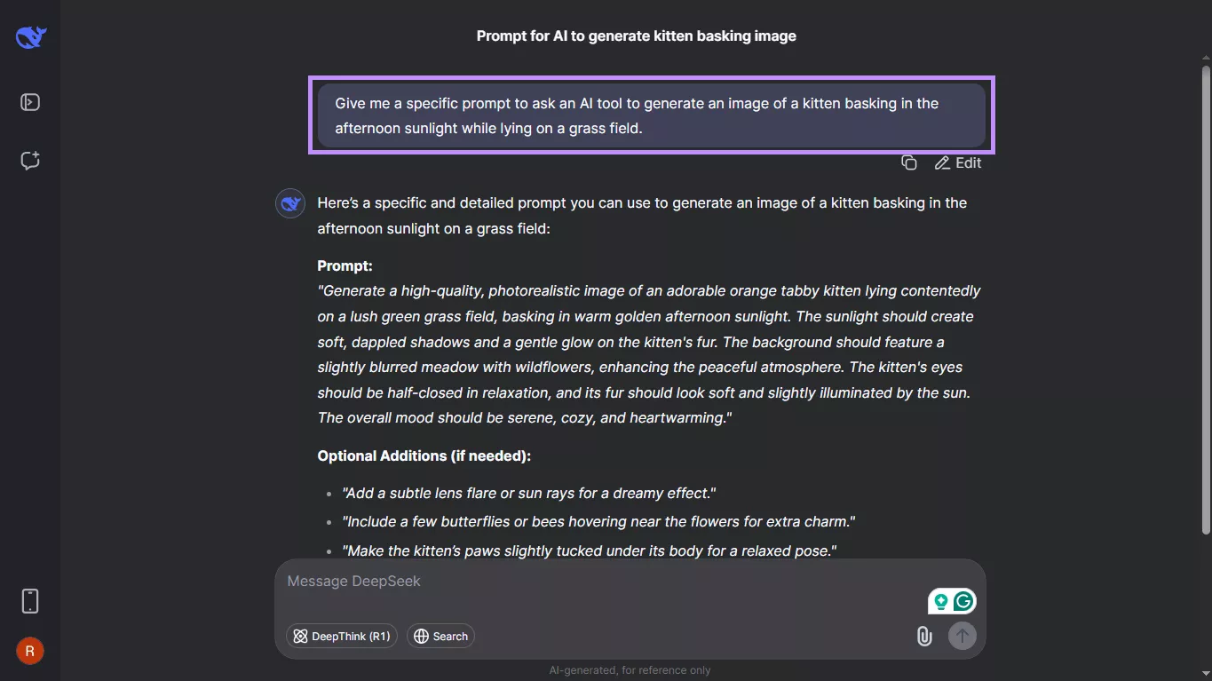 But creating such prompts can be tricky, right? To make things easier, you can generate quality prompts to chat with Deepseek AI. Then, use them to create images with Janus.