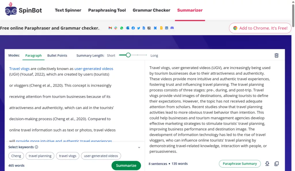 Moreover, how are Spinbot and UPDF when it comes to summarizing academic papers? We decided to test Spinbot using a paper on travel vlog from Google Scholar. Due to the 600-word upload limit of Spinbot’s "Summarizer" feature, we only selected the content from the first three paragraphs of the introduction section of the paper, which is approximately 465 words.