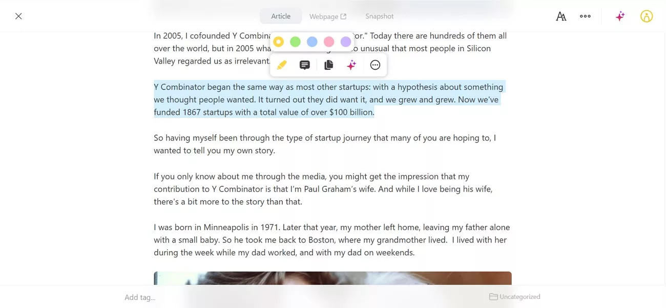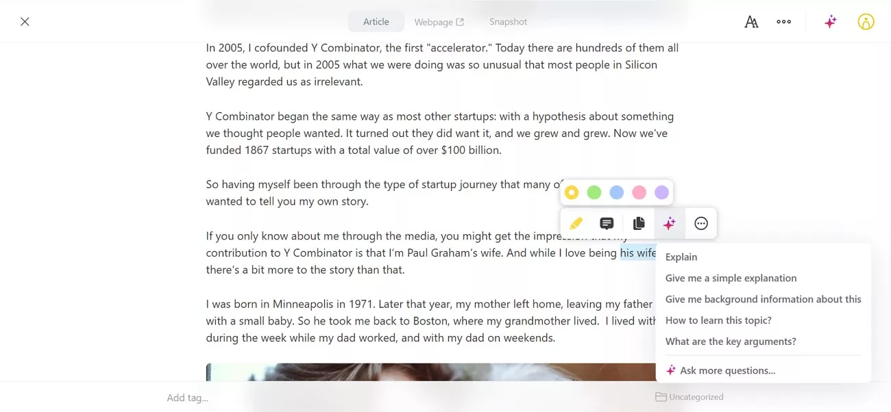 - AI-Powered Insight: Cubox Al Reading assistant uses advanced language models to provide automatic summarization, key point extractions, and question answering. This feature helps users quickly digest articles and focus on the most relevant information. Users can interact with the AI as it lets them select the text and click the AI star icon to receive tailored insights.