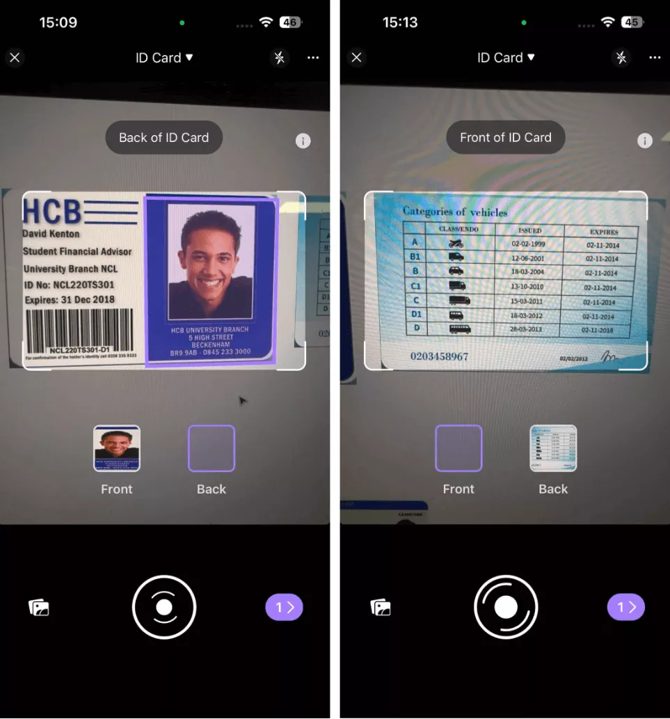 4. Take pictures of the card from both front and back using the camera. Once captured, tap the ">" arrow at the bottom right to continue.