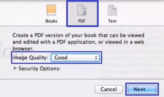 Step 2. Next, choose the "PDF" format button and set the "Image Quality" as per your requirements. In the end, press the "Next…" button to confirm the changes and move ahead.