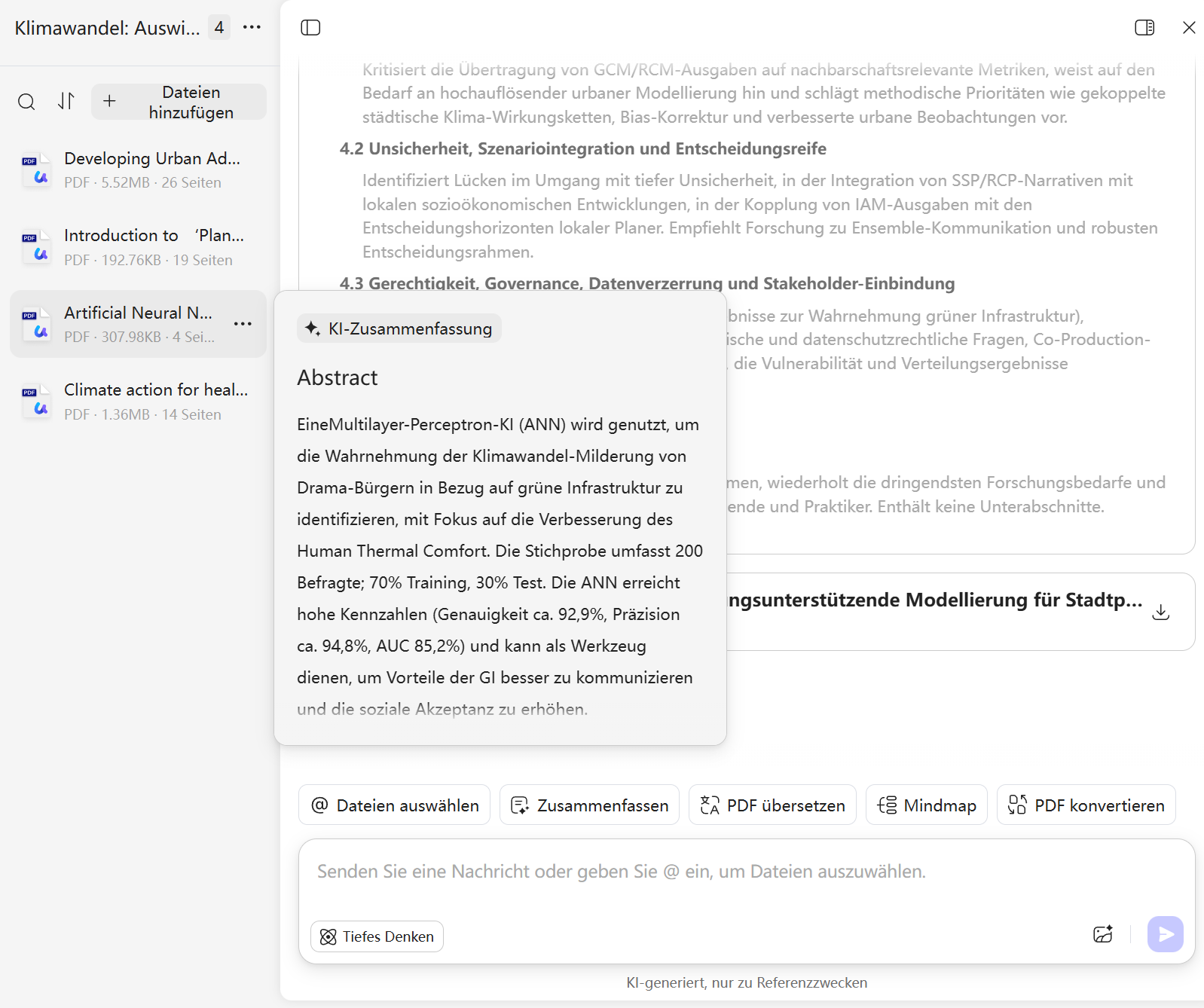 • Lassen Sie sich einzelne Inhalte erklären oder nutzen Sie Funktionen wie „Zusammenfassen (nach Seiten)“, „Übersetzen“ oder „Mind Map“. Alternativ können Sie einen Prompt eingeben und „Tiefes Denken“ für tiefere Einblicke verwenden.