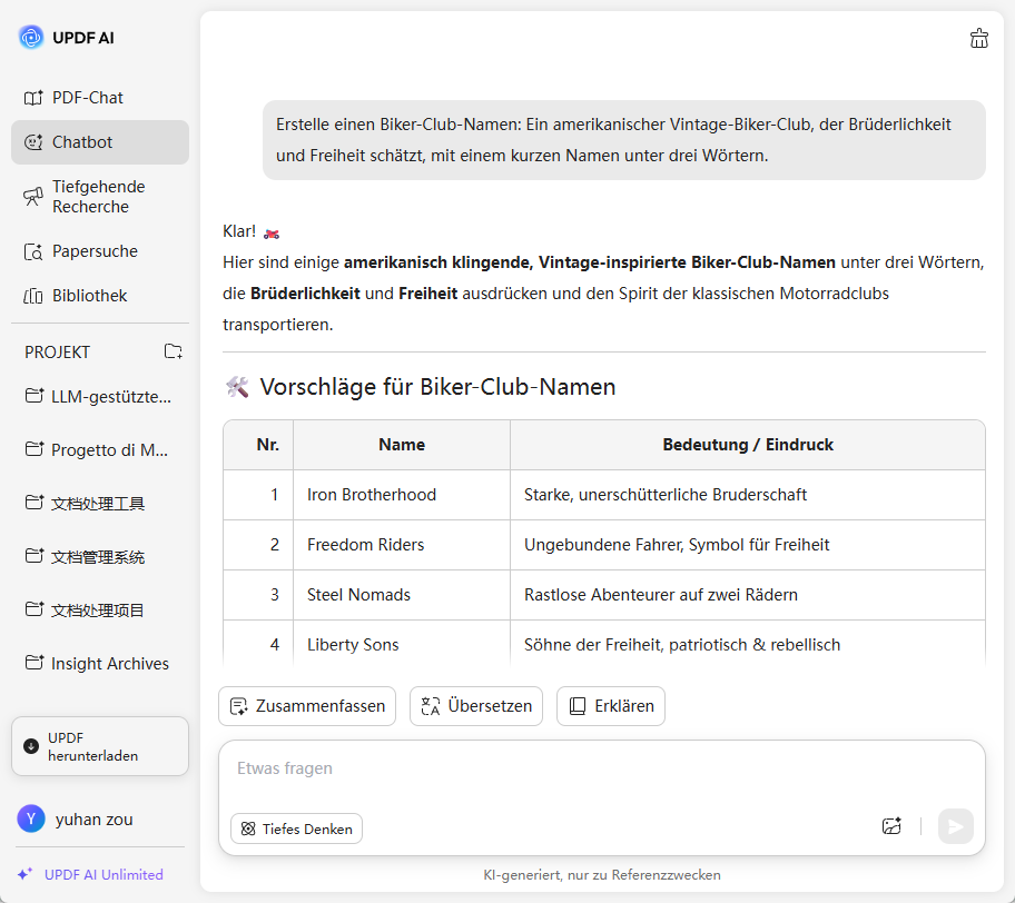 Mit integrierten ChatGPT-5 und DeepSeek R1 erstellt der UPDF AI Biker-Club-Namensgenerator reichhaltige, maßgeschneiderte und kreative Namensvorschläge, die wirklich die Kultur und Einstellung Ihres Clubs widerspiegeln.