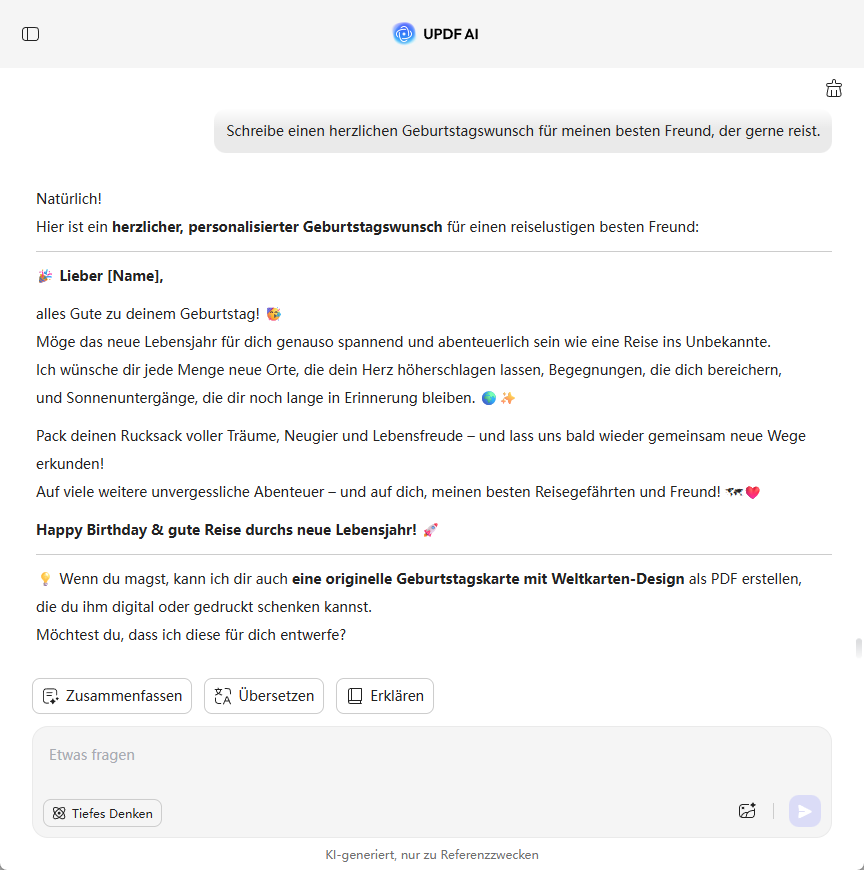 Im Gegensatz zu allgemeinen AI-Schreibtools ist der UPDF AI Geburtstagswunsch-Generator speziell für Geburtstagsgrüße entwickelt. Er versteht Töne wie lustig, romantisch oder professionell und sorgt dafür, dass jede Nachricht perfekt zum Empfänger und Anlass passt.