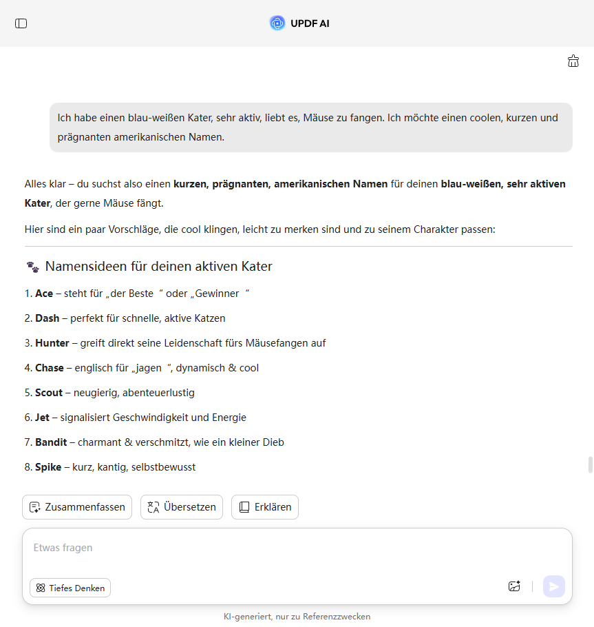 Der UPDF AI Katzennamen-Generator nutzt sowohl GPT-5 als auch DeepSeek R1. Er geht über einfache Schlüsselwörter hinaus und interpretiert Ihre komplexen Beschreibungen intelligent, um Namen zu erzeugen, die wirklich zum Bild Ihrer Katze passen – eine Tiefe, die andere Tools einfach nicht erreichen.