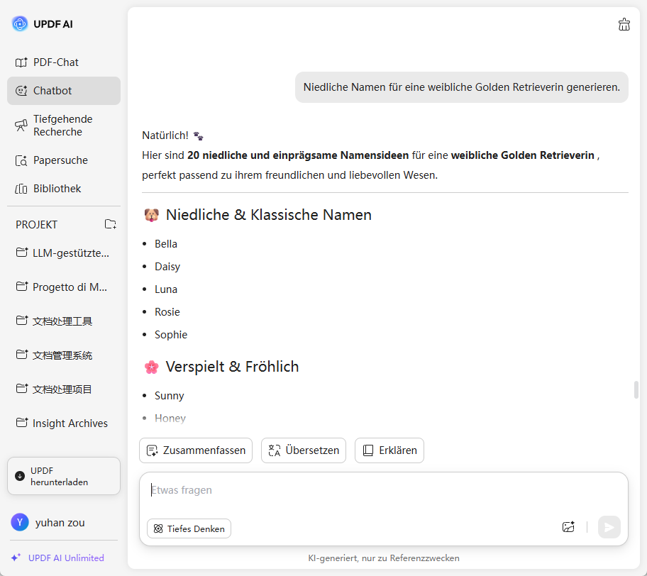 Nützlich für Blogger, Autoren oder Spieleentwickler, die Hundenamen für Charaktere, Geschichten oder Social-Media-Inhalte benötigen. UPDF AI liefert kreative und kulturell passende Vorschläge, die auf den Ton oder das Setting Ihres Projekts zugeschnitten sind.