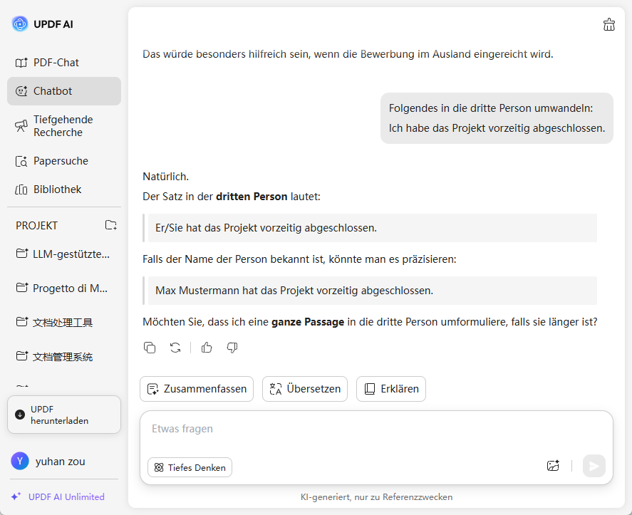 Der UPDF AI Konverter von der ersten zur dritten Person wandelt Texte zuverlässig in die dritte Person um, wobei Bedeutung, Ton und Kontext erhalten bleiben – für klare und professionelle Texte.