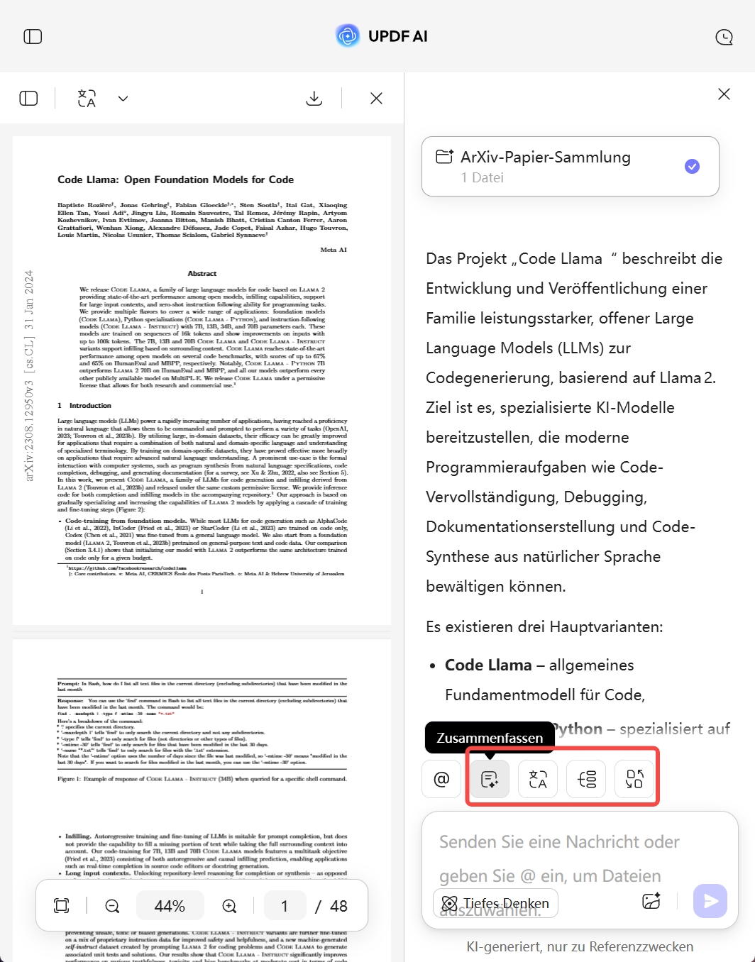 Zusammenfassen: Bei umfangreichen Berichten oder wissenschaftlichen Arbeiten sorgt UPDF AI sofort für Klarheit. Laden Sie das PDF hoch und erhalten Sie automatisch eine strukturierte Zusammenfassung. Sie können ausgewählte Seiten, die gesamte Datei mit einem Klick zusammenfassen oder Text für eine individuelle Zusammenfassung einfügen – ideal für schnelleres und effizienteres Lesen.
