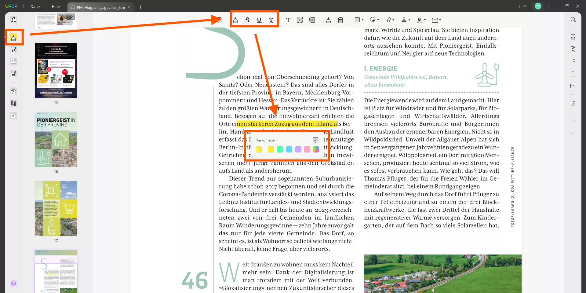 Klicken Sie in der linken Seitenleiste auf das Menü „Kommentar“. Danach können Sie in der oberen Menüleiste die Icons „Hervorheben“, „Durchgestrichen“, „Unterstrichen“ und „Wellenlinie“ auswählen und entsprechend beschriften.