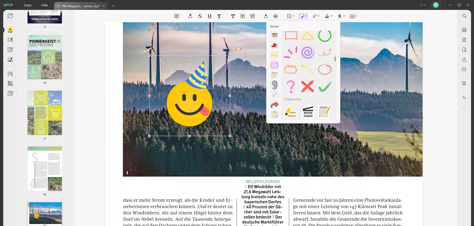 UPDF bietet über 100 Aufkleber, die Sie in das PDF einfügen können, um es ansprechender zu gestalten. Um auf die Aufkleber zuzugreifen, klicken Sie auf das Icon „Sticker“ und wählen Sie den gewünschten Aufkleber aus.