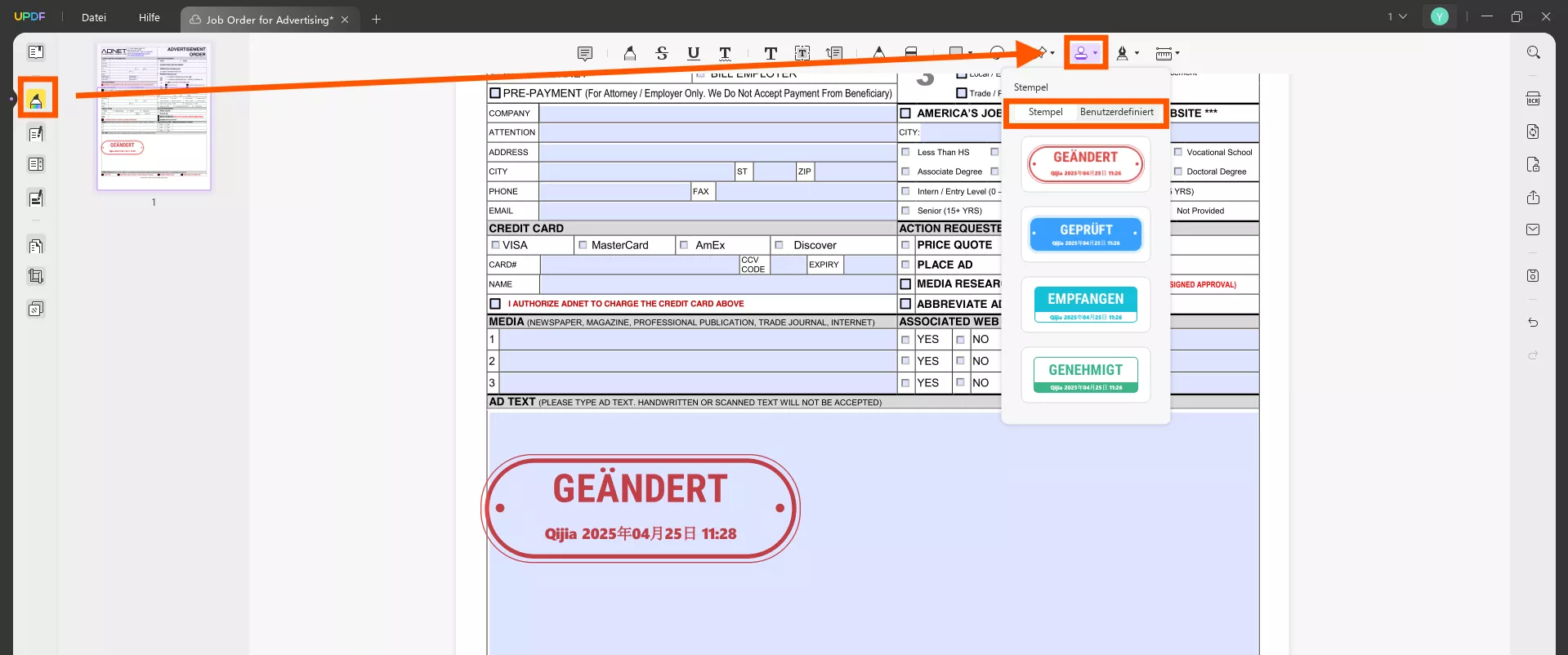 Mit UPDF können Sie verschiedene Arten von Stempeln hinzufügen, z. B. überarbeitet, geprüft, genehmigt usw. Sie können sogar eigene Stempel erstellen oder importieren.