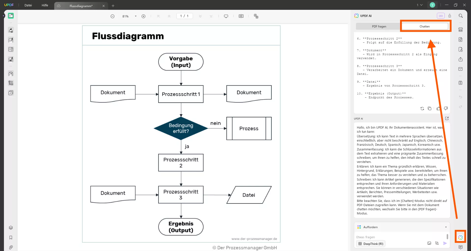 Schritt 2: Sobald Ihre PDF-Datei geöffnet ist, klicken Sie unten rechts auf „UPDF AI“. Dadurch öffnet sich das KI-Assistentenfenster. Wählen Sie oben den „Chatten“-Modus.