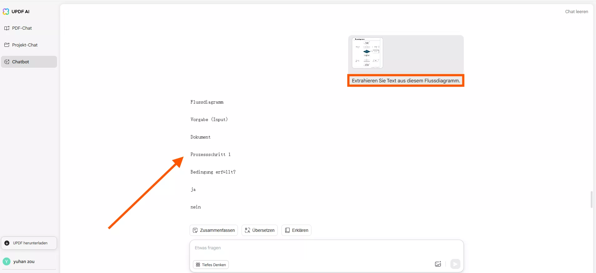 Schritt 5: Klicken Sie in das Textfeld und geben Sie Ihre Eingabe ein, um das Flussdiagrammbild in Text umzuwandeln. Drücken Sie anschließend die Eingabetaste, um es zu senden. UPDF AI analysiert das Diagrammbild schnell und extrahiert den Text.