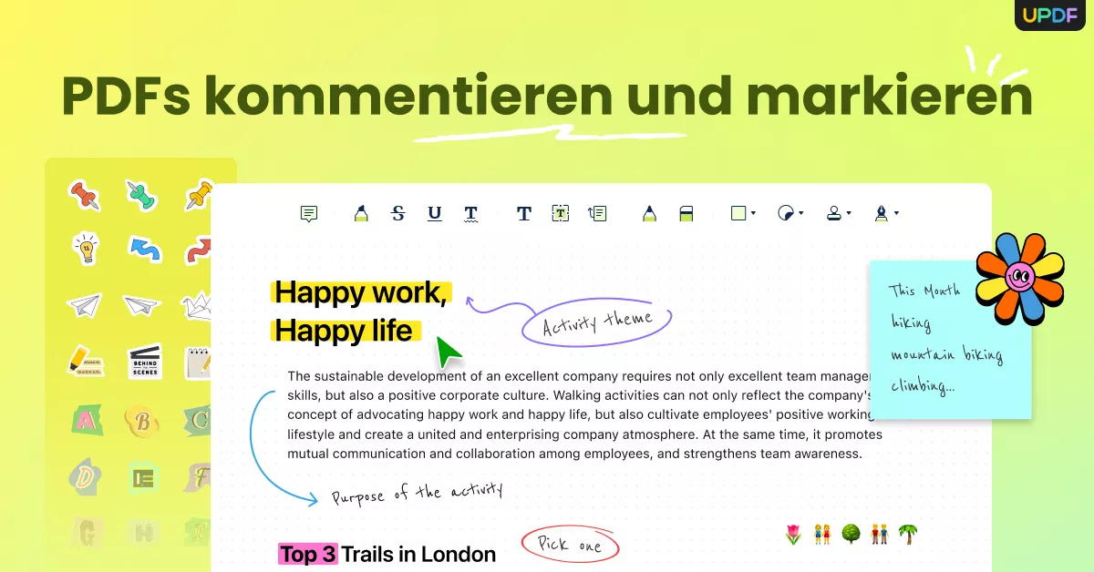 - Aufkleber zur Verbesserung des Engagements: Das Hinzufügen von Stickern an beliebiger Stelle in Ihrem Dokument kann das Engagement der Nutzer verbessern. Sie können Sticker einfügen, um Emotionen und den Kontext unterhaltsam auszudrücken. Mit UPDF können Sie überall in einer PDF-Datei Sticker einfügen. In Adobe Acrobat und PDF Expert gibt es eine solche Funktion nicht.