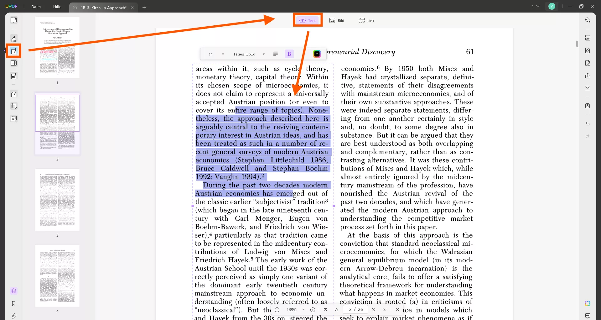 Schritt 1: Doppelklicken Sie auf das Icon auf dem Desktop, um die UPDF-Software auf Ihrem Computer zu starten, so dass Sie Ihr von Google Keep umgewandeltes PDF öffnen können. Klicken Sie auf „Datei öffnen“ und wählen Sie das PDF aus dem lokalen Speicher Ihres PCs, um die Datei zu öffnen. Klicken Sie dann auf „PDF bearbeiten„ und wählen Sie oben „Text“, um den Inhalt des Dokuments zu bearbeiten.