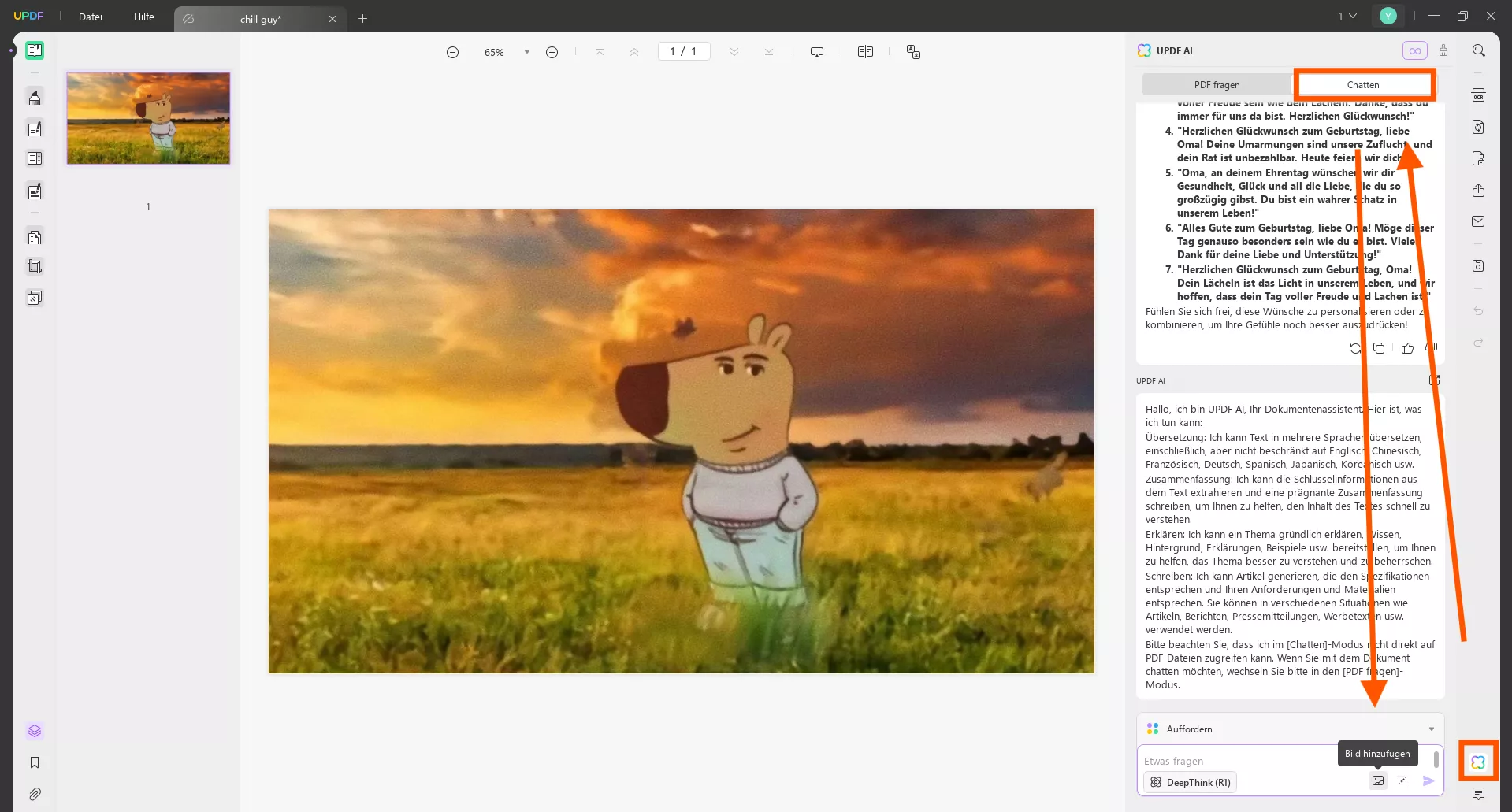 Wenn Sie das Bild als PDF importieren, öffnen Sie das Symbol „UPDF AI“ und gehen Sie zum Abschnitt „Chatten“. Wählen Sie das Symbol „Bild“, um den Meme-Screenshot hochzuladen.