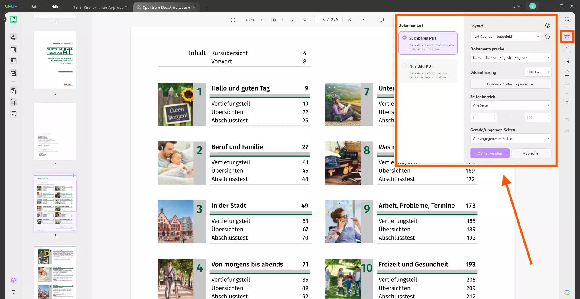 Wenn Sie ein gescanntes eBook haben, gehen Sie zum rechten Seitenbereich und wählen Sie das Icon „Text mit OCR erkennen“. Nachdem Sie als „Dokumentart“ „Suchbares PDF“ ausgewählt haben, können Sie weitere OCR-Einstellungen vornehmen.