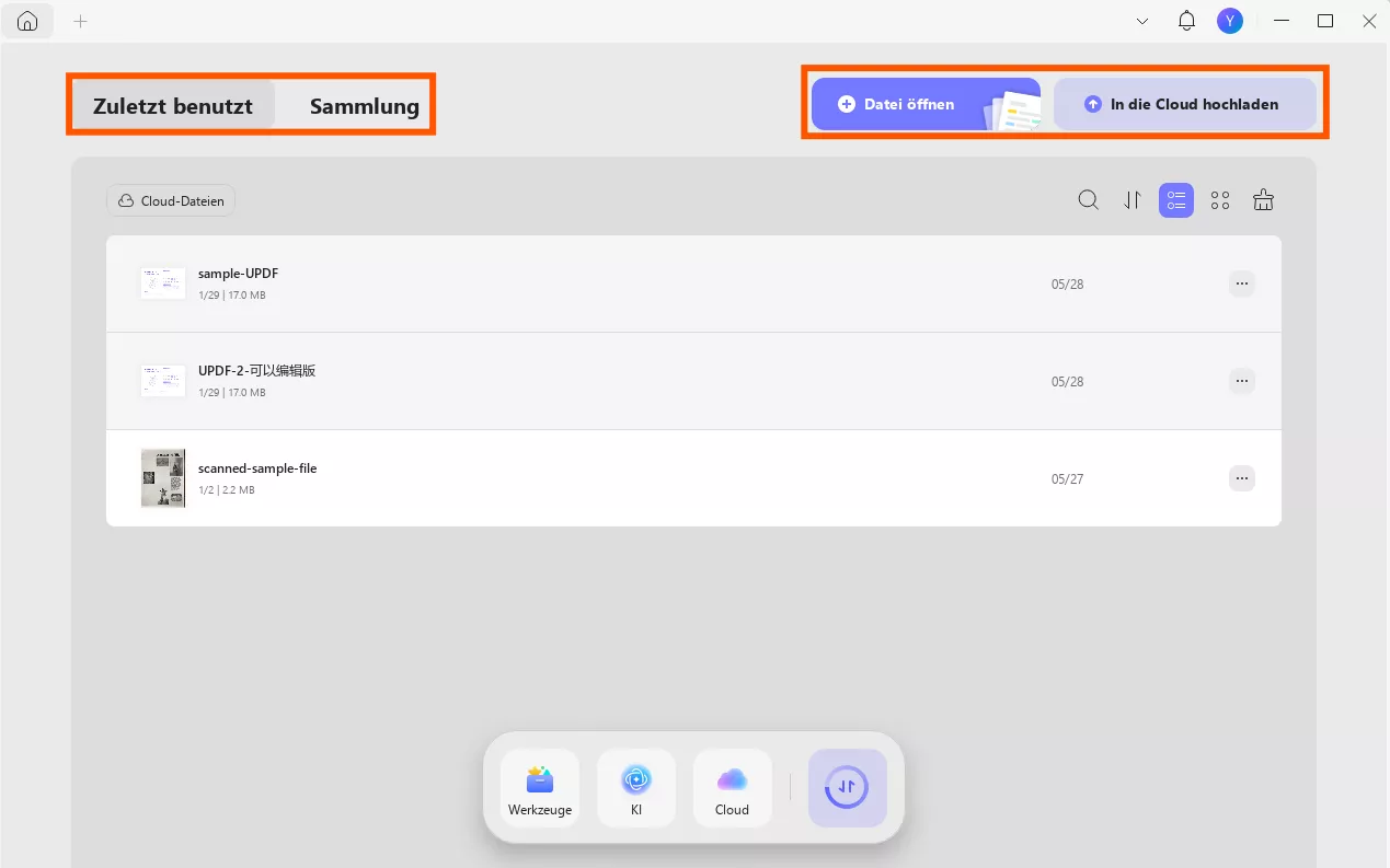 Die alte UPDF-Oberfläche gruppierte Tools in Menüs wie dem Reiter „Datei“. Der neu gestaltete Startbildschirm bietet nun schnellen Zugriff auf wichtige Tools, ohne dass Sie sich durch umfangreiche Listen wühlen müssen. Die am häufigsten verwendeten Tools finden Sie im Bereich „Werkzeuge“ . Über die Schaltfläche „KI“ gelangen Sie zur UPDF-KI. Klicken Sie auf „Cloud“, um Ihre Cloud-Dateien zu überprüfen und zu verwalten.