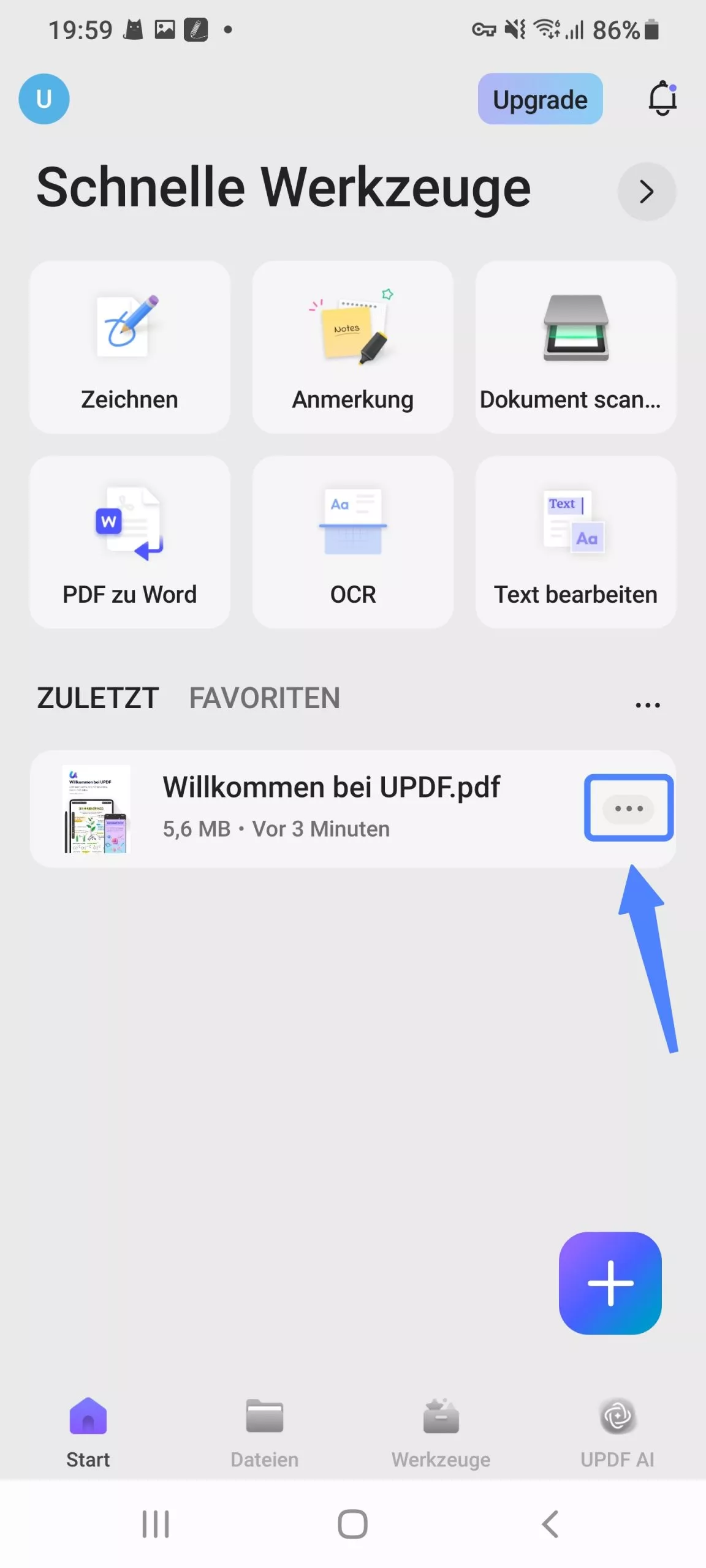 Schritt 1. Falls Sie UPDF noch nie zuvor verwendet haben, klicken Sie zunächst auf die Schaltfläche „+“ unten, um Dateien von Ihrem Android-Gerät in UPDF zu importieren.
