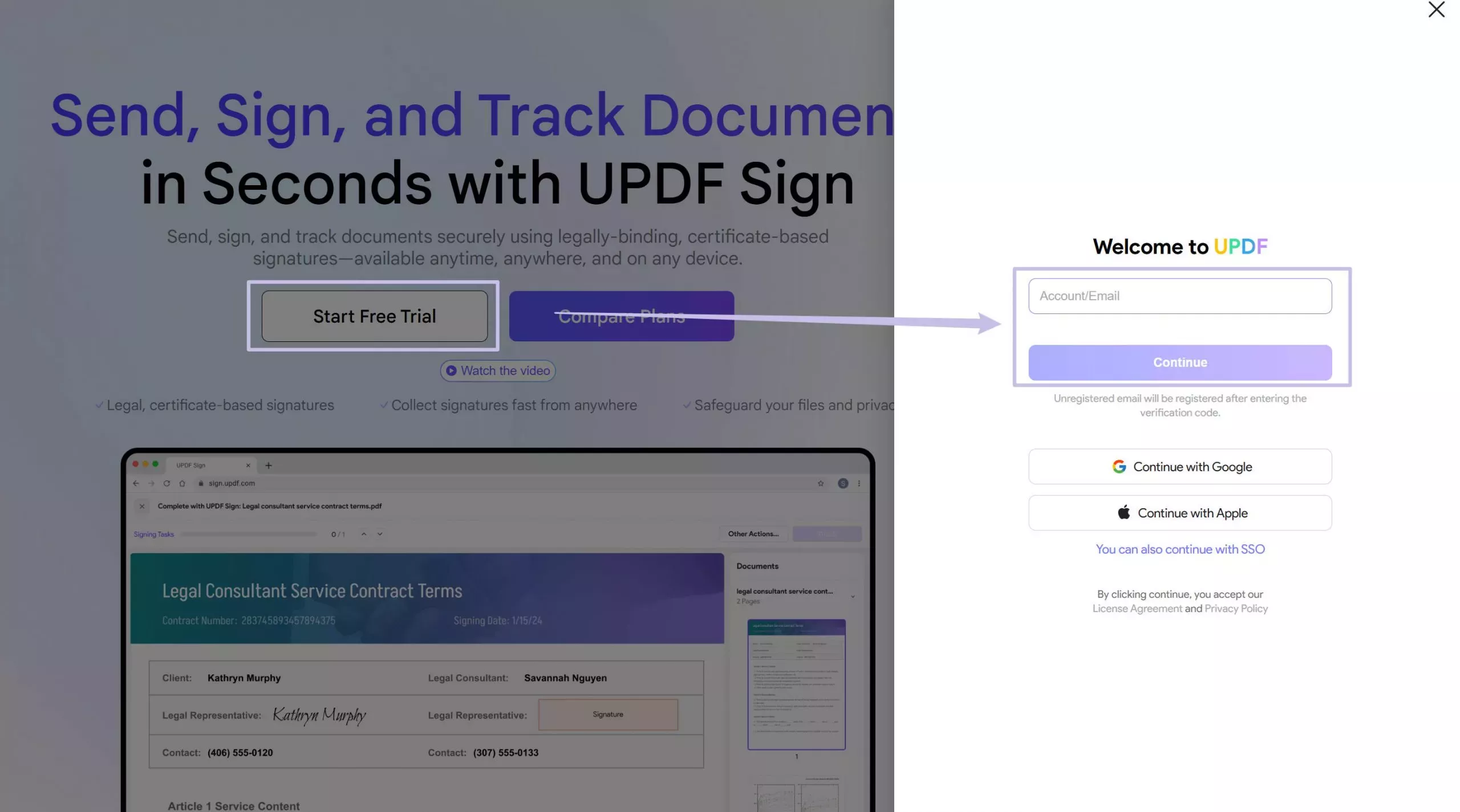- Öffnen Sie die Website von UPDF Sign und klicken Sie auf die Schaltfläche „Kostenlose Testversion starten“ in der oberen rechten Ecke des Bildschirms.