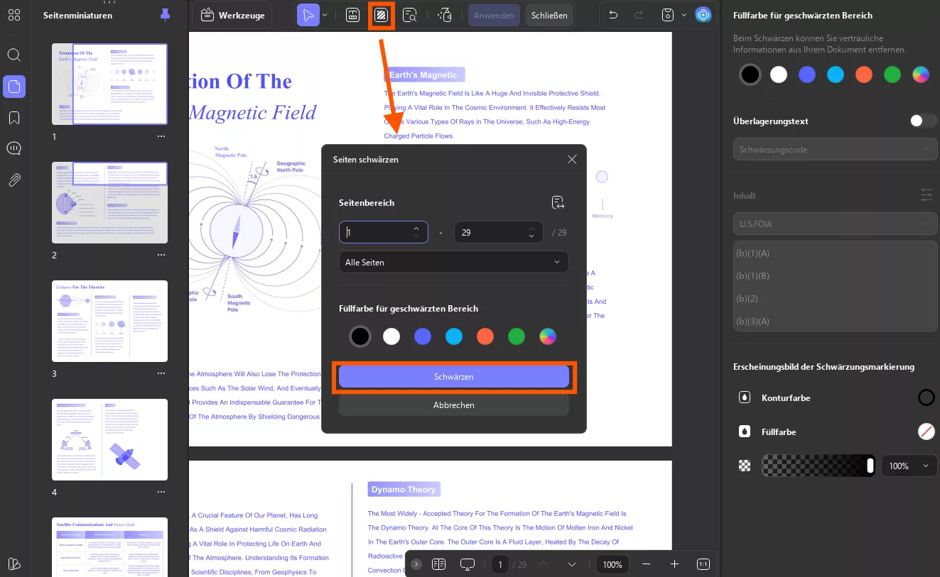 Sie können auch mehrere Seiten gleichzeitig redigieren. Wählen Sie in der oberen Symbolleiste die Option „Seiten schwärzen“ und legen Sie den Seitenbereich entsprechend fest.
