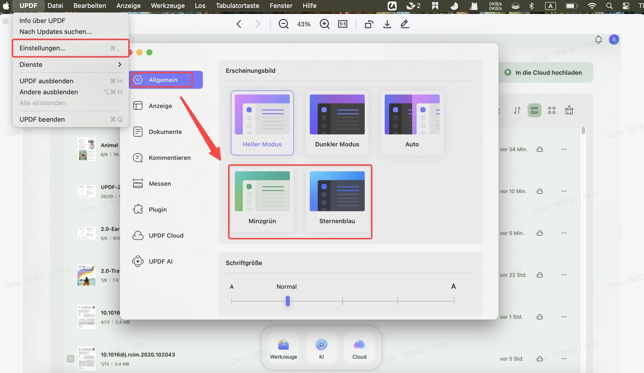 1. Unterstützt den Dunkelmodus. Standardmäßig werden die Systemeinstellungen befolgt. Sie können ihn auch in den UPDF-Einstellungen festlegen (Tastenkombination zum Aufrufen der Einstellungen: Strg + K).