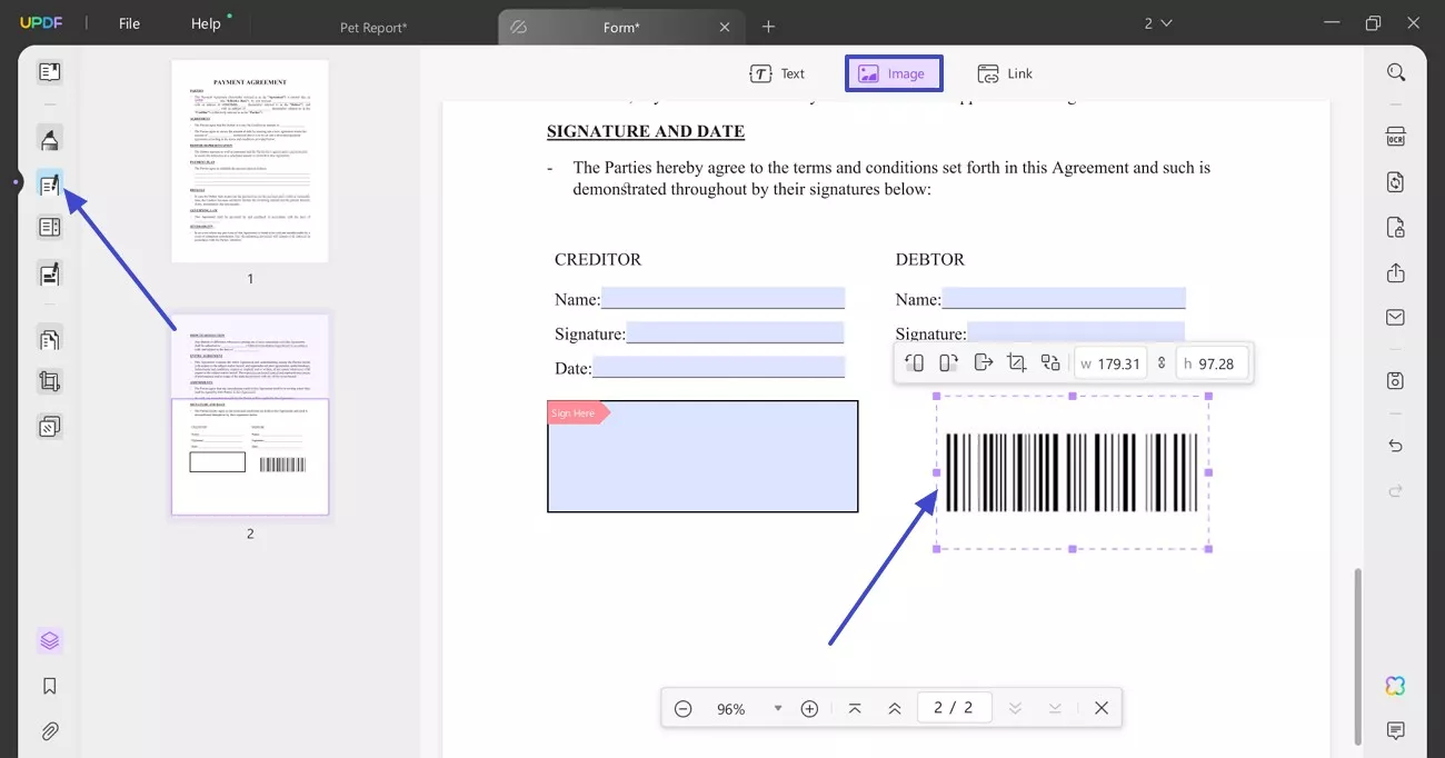 - Resize and Reposition Barcode Freely: After inserting a barcode image, UPDF allows you to drag and resize the image box with precision. You can place it exactly where it's needed—whether it's a product label, invoice, or form.