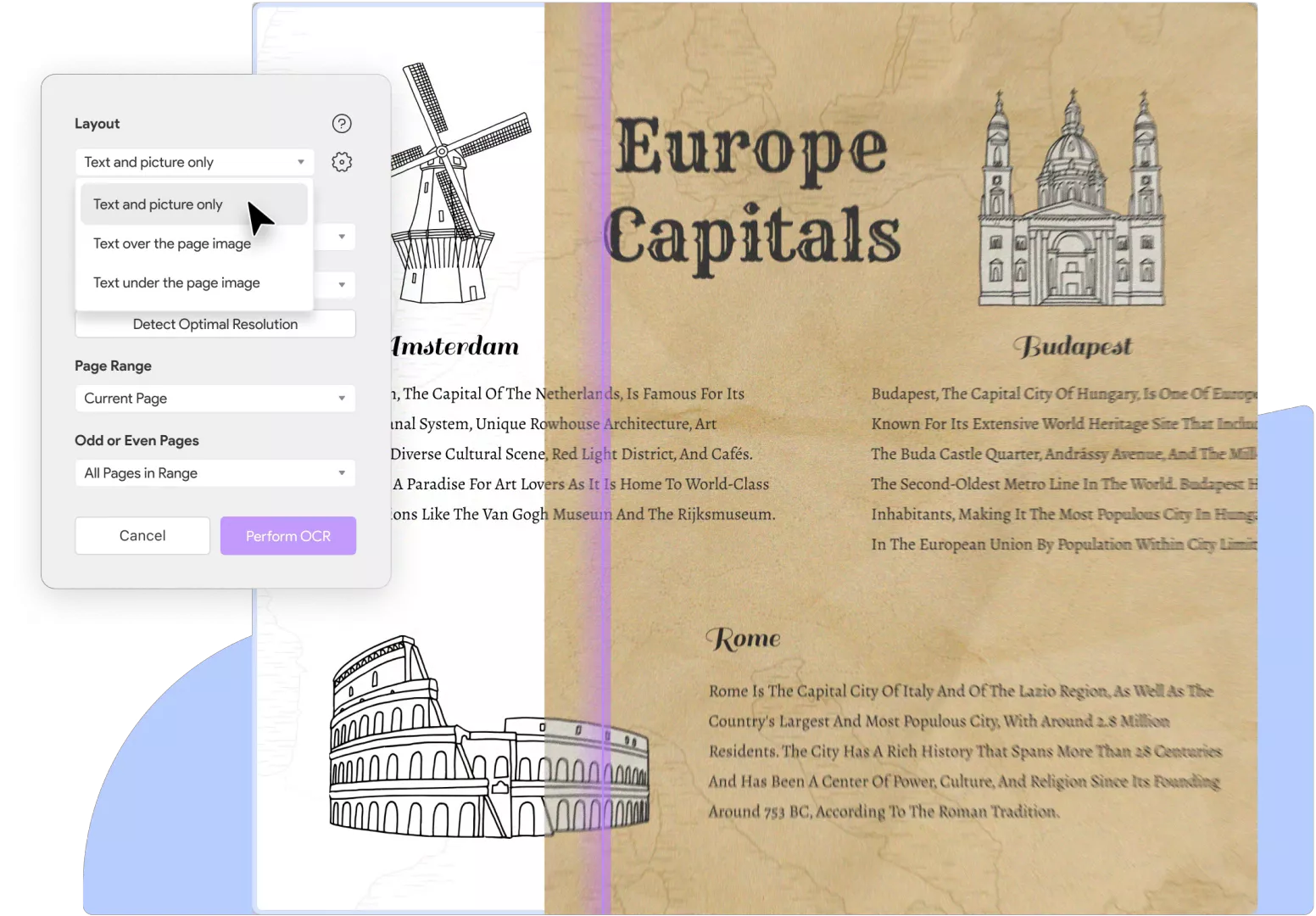 The source’s background and illustrations are preserved, with the recognized text overlaid on top. Resulting files are typically larger than those from the Editable PDF option, and the visual appearance can differ marginally.