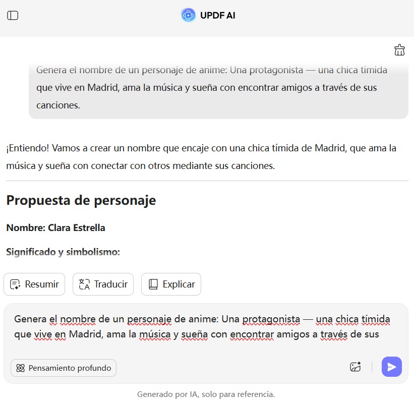 Genera rápidamente nombres distintivos para personajes durante la construcción del mundo o la planificación de historias. El Generador de Nombres de Personajes de Anime con UPDF AI ayuda a alinear cada nombre con la personalidad de tu personaje y el tono narrativo, ahorrando tiempo creativo.