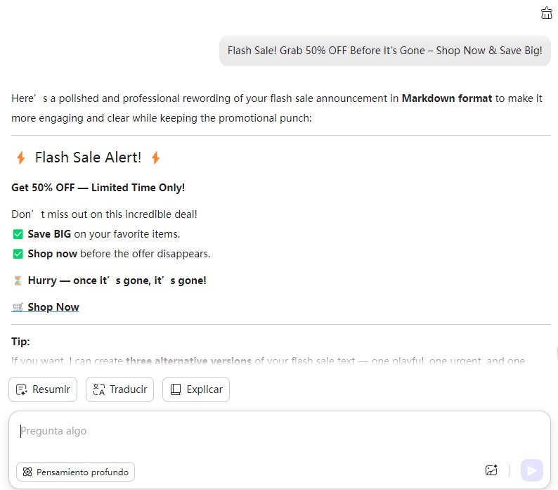 Ingresa Tu Mensaje. Describe el tipo de llamada a la acción que necesitas, incluyendo tu objetivo de marketing, audiencia y tono—como persuasivo, amigable o urgente. Por ejemplo: "Genera una CTA pegadiza para una campaña de descuento por tiempo limitado."