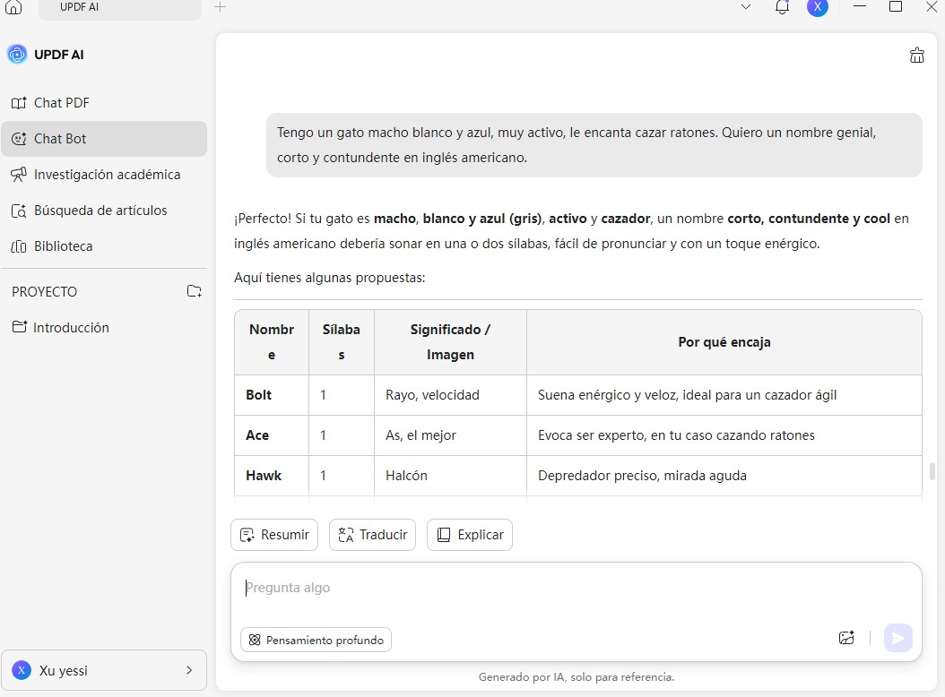 El Generador de Nombres para Gatos UPDF AI incluye tanto GPT-5 como DeepSeek R1. Va más allá de simples palabras clave para interpretar inteligentemente todas tus descripciones complejas, generando nombres que realmente se ajustan a la imagen de tu gato—un nivel de profundidad que otras herramientas simplemente no pueden igualar.