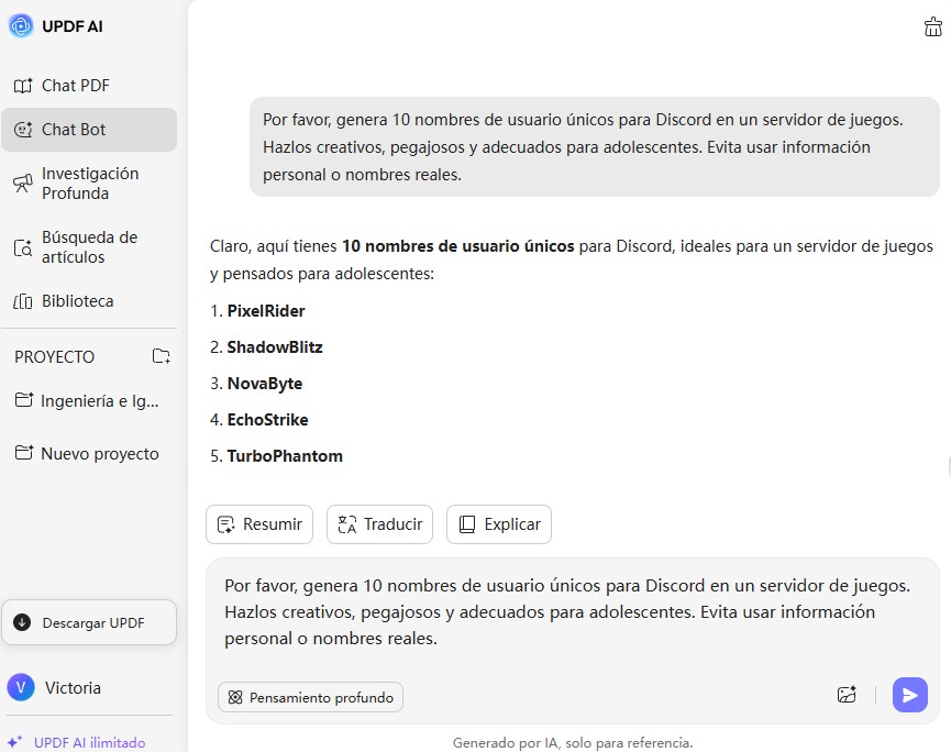 UPDF AI puede dar nombres de usuario para Discord en varios idiomas, permitiendo a los usuarios de todo el mundo poseer nombres que reflejen su idioma, cultura o estilo.