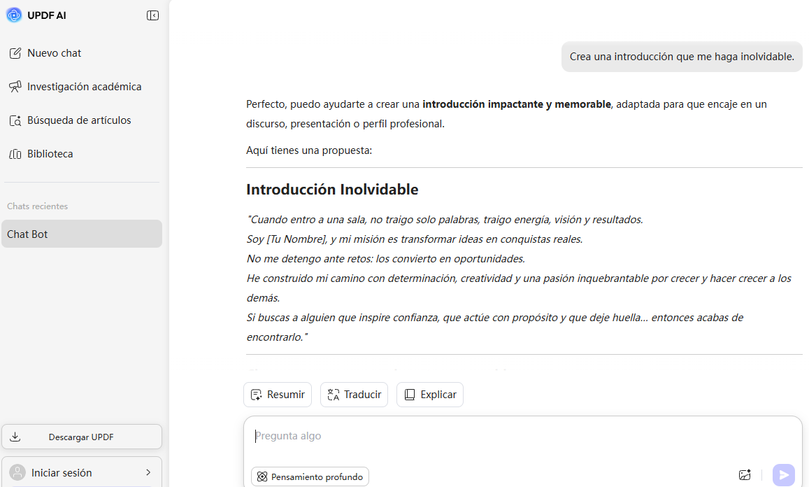 El Generador de Introducciones UPDF AI no se limita a biografías personales. Puede crear introducciones atractivas para artículos, informes, presentaciones, discursos y publicaciones en redes sociales, adaptando cada intro al contexto y ayudándote a captar la atención de tu audiencia al instante.