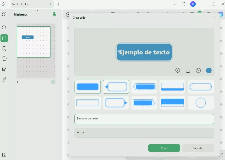 Arrastra y suelta ambos archivos en el área «Abrir archivo» de UPDF. No los combines en un solo PDF. Navega hasta el PDF que contiene el sello que deseas copiar. Si ya tienes un sello en un PDF, puedes pasar al siguiente paso. Si desea crear un nuevo sello, puede hacer clic en "Herramientas" > "Comentario" > "Sellos". En la herramienta de sellos, seleccione "Personalizado" > "Crear". Elija la plantilla de sello que desea personalizar y, a continuación, edite los ajustes, como el texto, el color, la fecha y la hora. Haga clic en Crear.