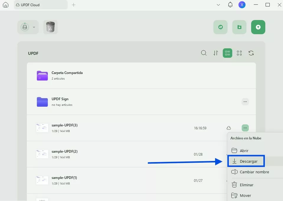Ahora puede ir al segundo ordenador en el que está trabajando y abrir UPDF. Inicie sesión en la misma cuenta de UPDF que utilizó en el paso 1. A continuación, haga clic en "Nube", busque el PDF con el sello que ha subido, haga clic en los tres puntos, seleccione "Descargar" para descargar el PDF en su ordenador.