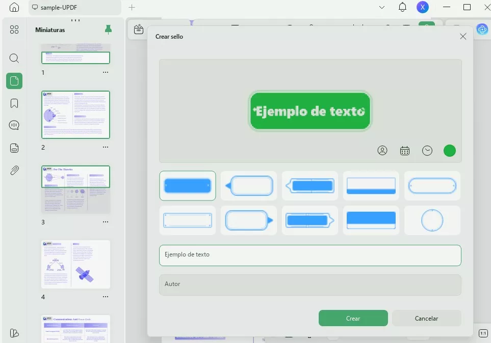 También puedes crear tu propio sello personalizado en UPDF. Haz clic en "Comentario" y luego selecciona la herramienta de sello. Elige "Personalizado" > "Crear". Elige la plantilla de sello que prefieras y luego personaliza la fecha, la hora, el color y el texto. Haz clic en "Crear" para agregar el sello al PDF. Ahora puedes hacer una captura de pantalla para copiarlo a otros documentos.