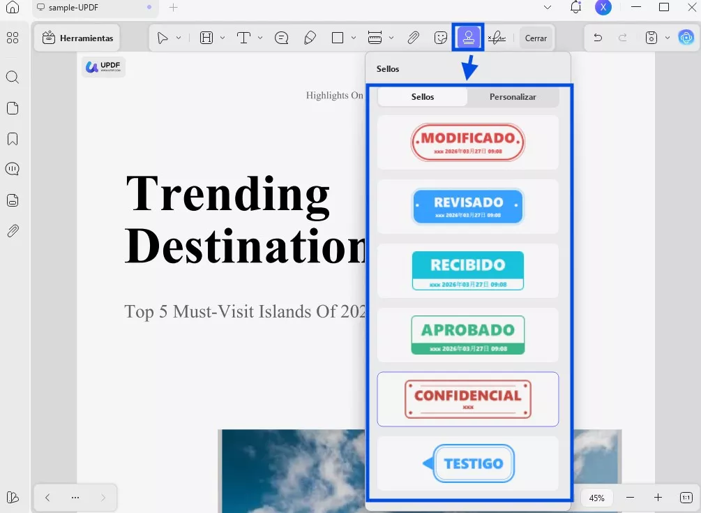 Abre UPDF e importa tu PDF mediante la opción «Abrir archivo». Una vez importado el archivo PDF a UPDF, haz clic en el icono «Comentario» dentro de «Herramientas», situado en la parte izquierda de la pantalla. A continuación, haz clic en el icono «Sellos» situado en la parte superior de la pantalla. Selecciona el sello que desees en el menú desplegable «Sellos» y añádelo al documento. También puedes utilizar la opción «Personalizado» para crear tu propio sello.