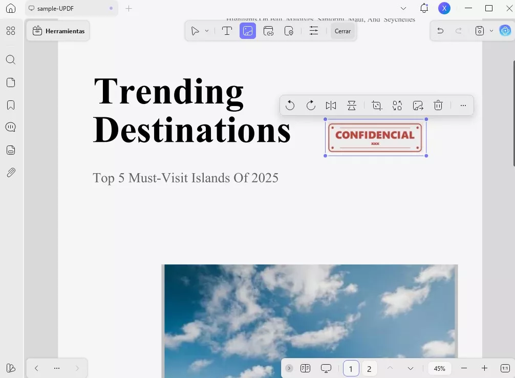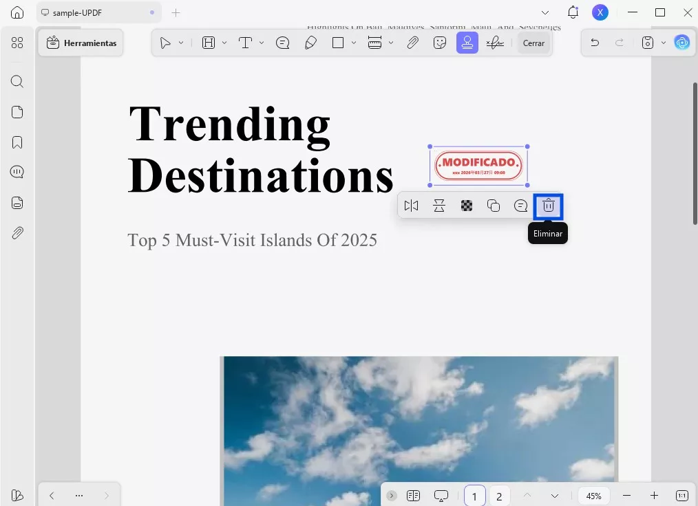 Además de permitir crear sellos, UPDF también ofrece funciones para eliminarlos. Si tus sellos han sido creados con editores de PDF, puedes utilizar este método para eliminarlos fácilmente del PDF.