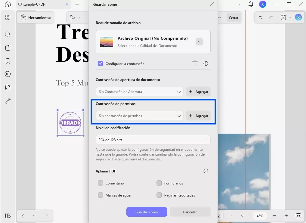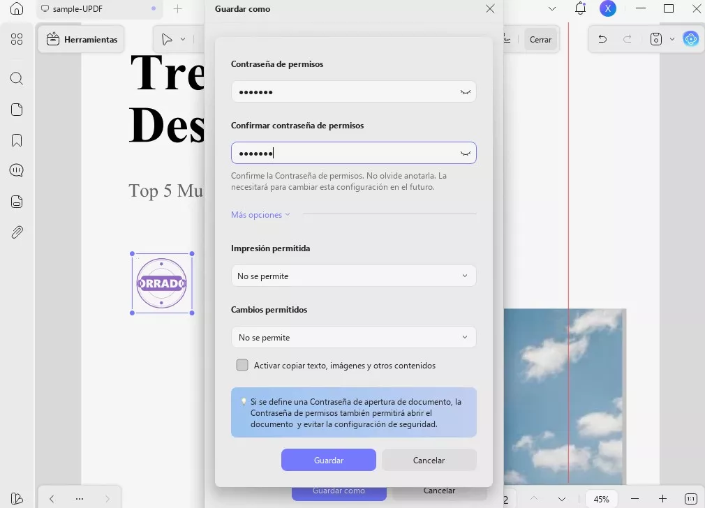 Se abrirá una pequeña ventana en la que deberás introducir la contraseña que desees en los campos «Contraseña de permisos» y «Confirmar contraseña de permisos». A continuación, haz clic en «Guardar» para guardar el documento protegido en la ubicación deseada del dispositivo.