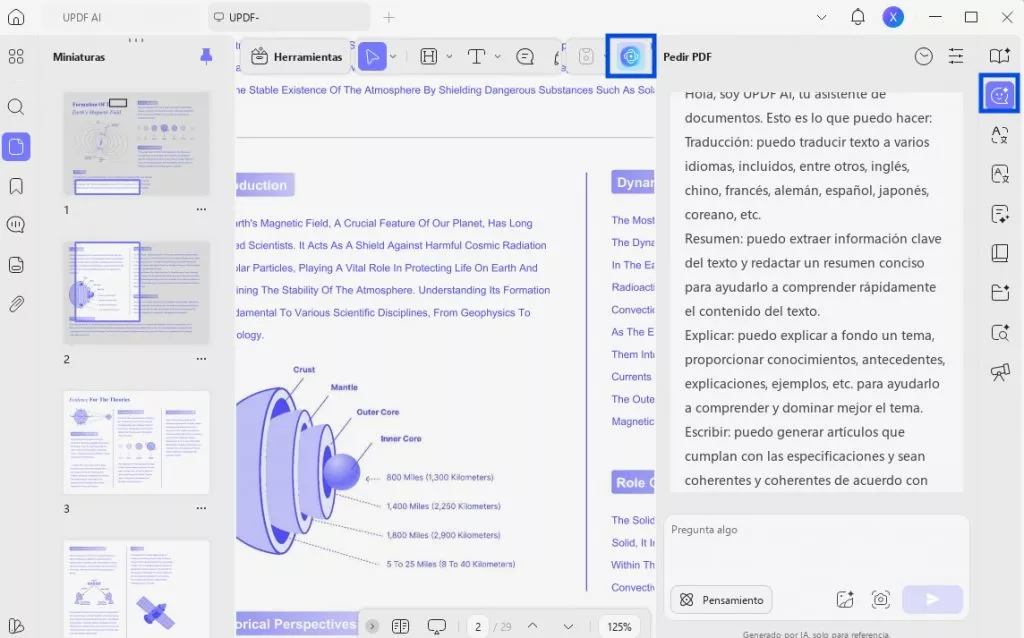 UPDF AI es el mejor escritor de poesía con IA, que produce poemas excelentes en diferentes tonos y temas utilizando solicitudes. También puedes usar UPDF AI para generar poemas interesantes en diversos estilos de manera rápida. Además, puede utilizarse para resumir, explicar y traducir poemas a otros idiomas de forma comprensiva en cuestión de segundos.