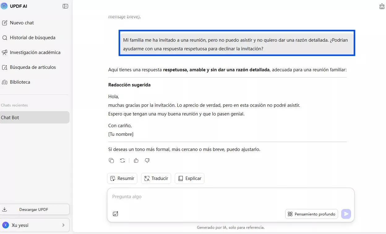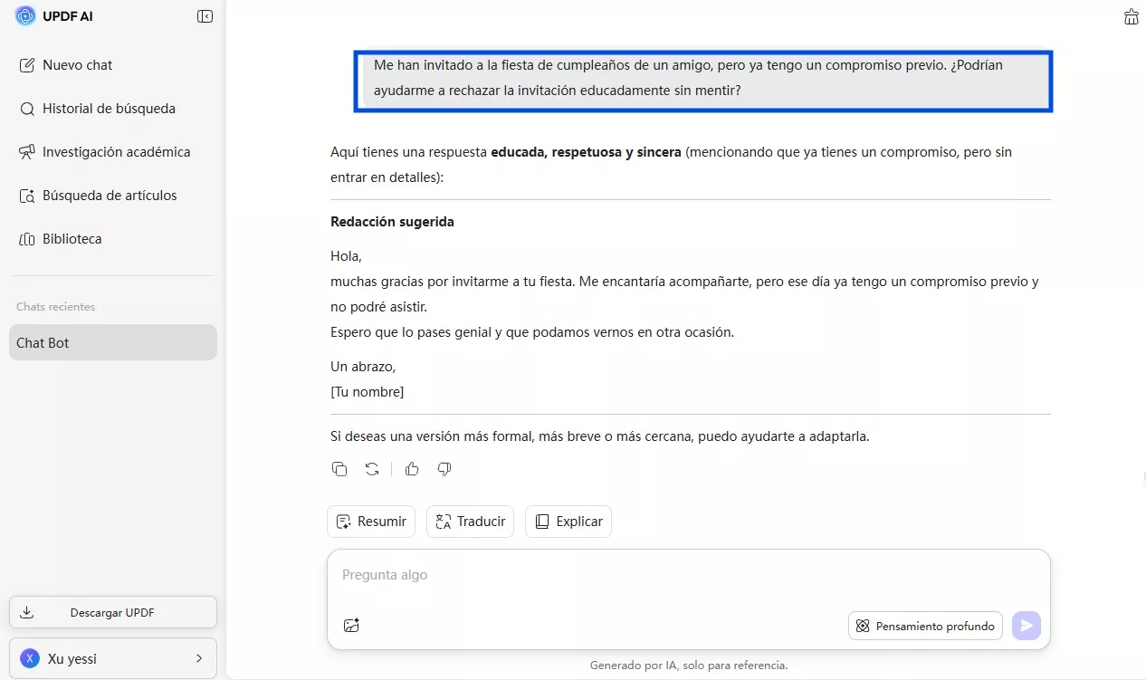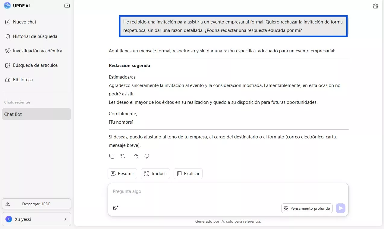 A continuación se muestran algunos ejemplos de indicaciones y respuestas eficaces de UPDF AI para rechazar una invitación de forma educada sin mentir: