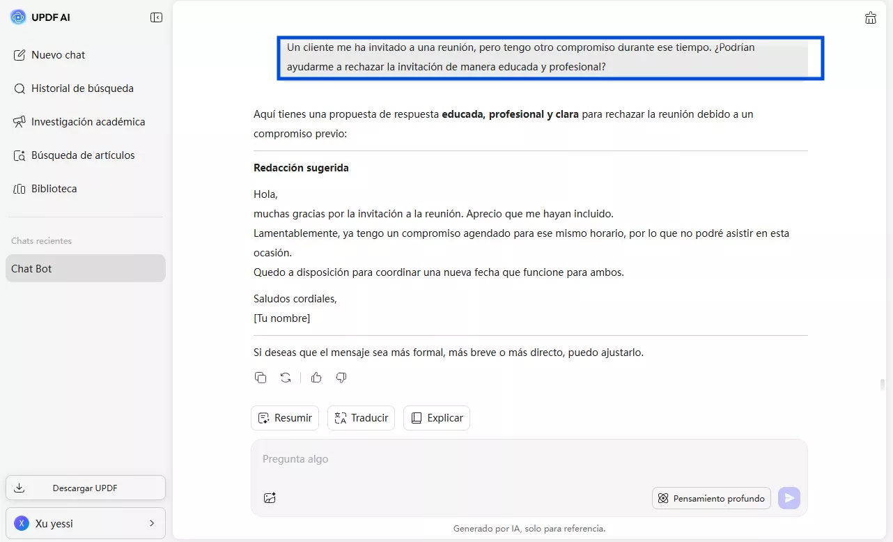 Si te invitan a una reunión pero tienes otra tarea que hacer, utiliza la siguiente respuesta de UPDF AI: