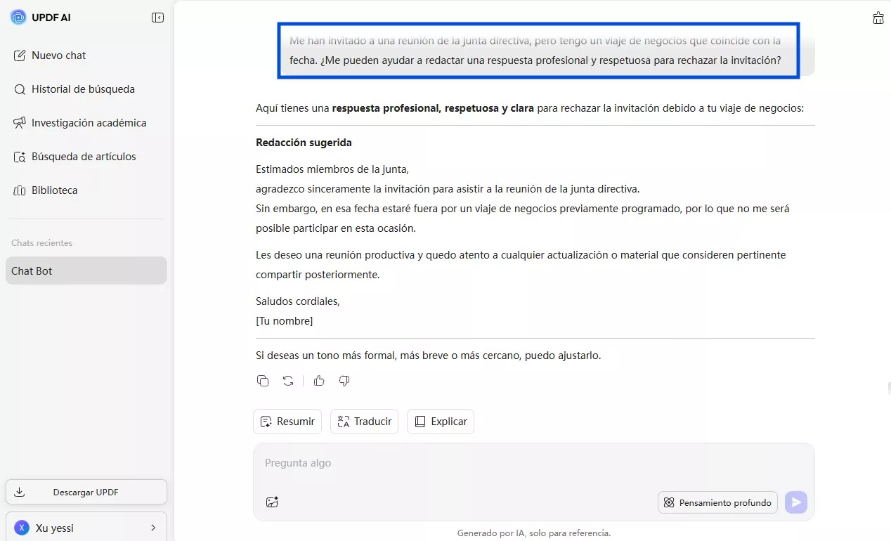 Si te invitan a una reunión de la junta directiva pero tienes un viaje oficial, utiliza la siguiente respuesta de UPDF AI para rechazar la invitación:
