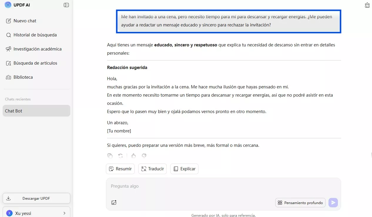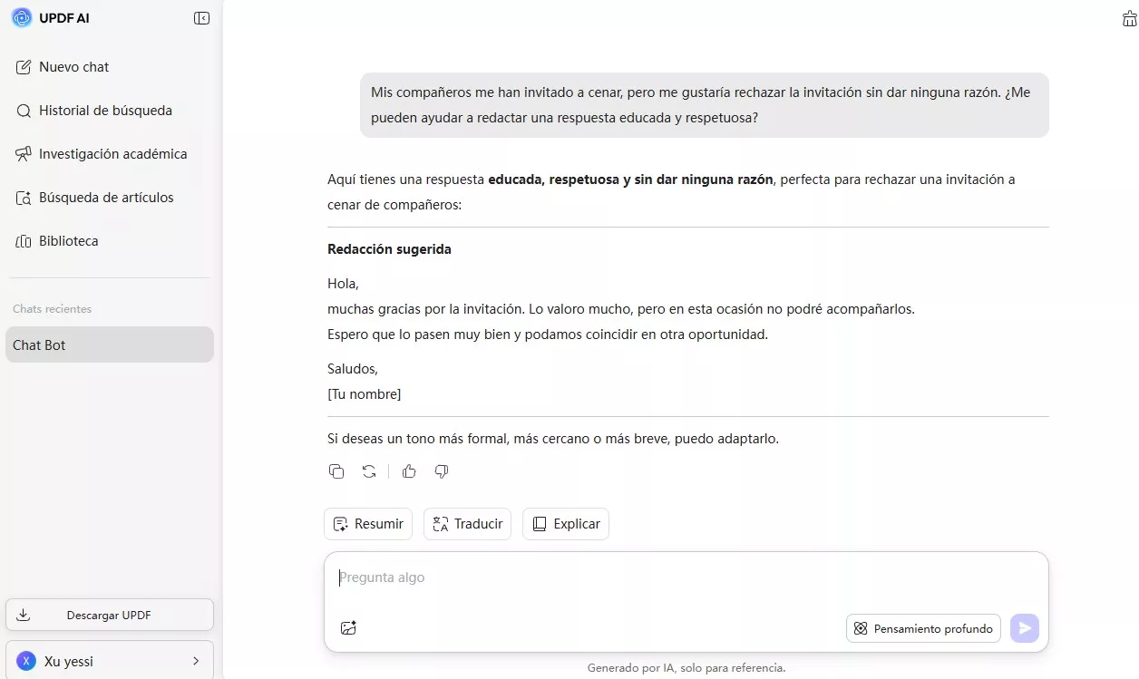 Si te invitan a una cena pero necesitas tiempo para ti, utiliza la siguiente respuesta de UPDF AI: