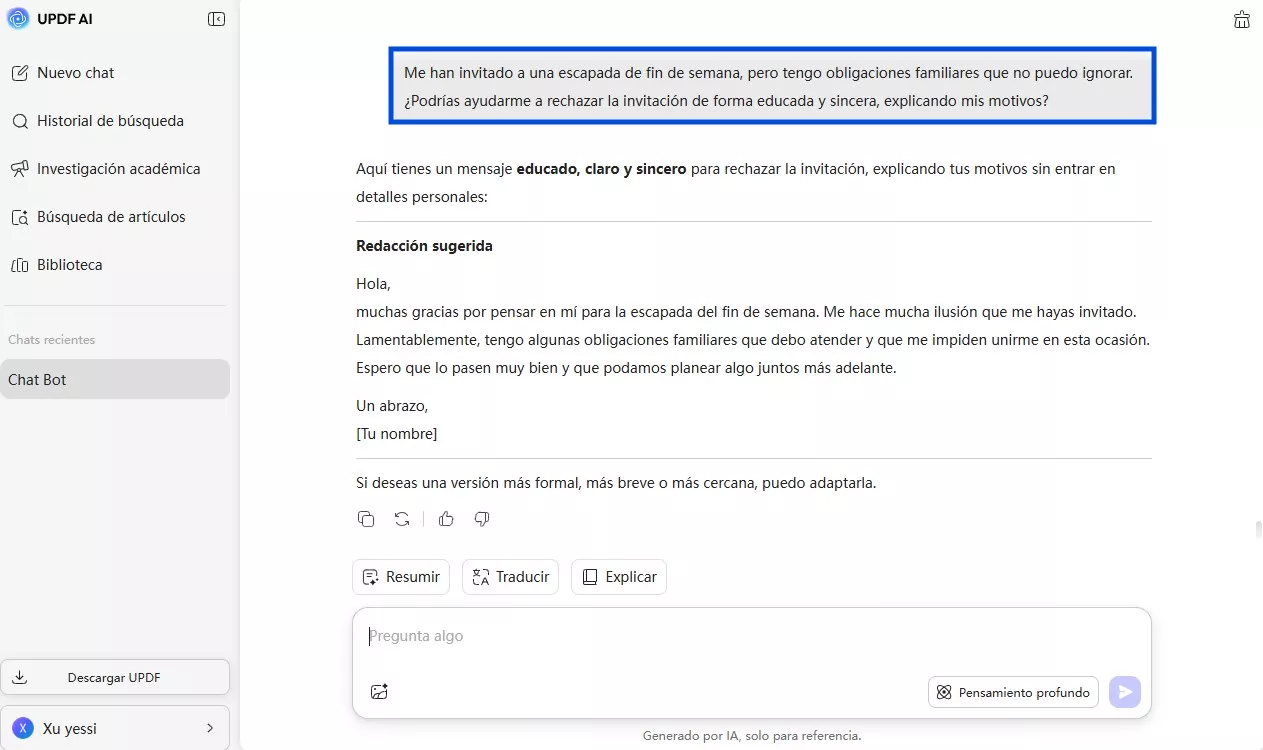 Si te invitan a una escapada de fin de semana pero tienes obligaciones familiares, utiliza la siguiente respuesta de UPDF AI: