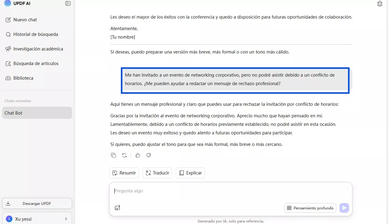 Si te invitan a un evento de networking corporativo pero no puedes asistir, utiliza la siguiente respuesta de la IA de UPDF: