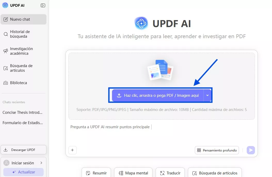 Lo mejor de todo es que no es necesario registrarse para utilizar la herramienta. Además, ofrece 100 sugerencias gratuitas. ¡Visita UPDF AI Online para empezar a utilizarla ahora mismo! A continuación, sigue estos pasos para estudiar de forma más inteligente.