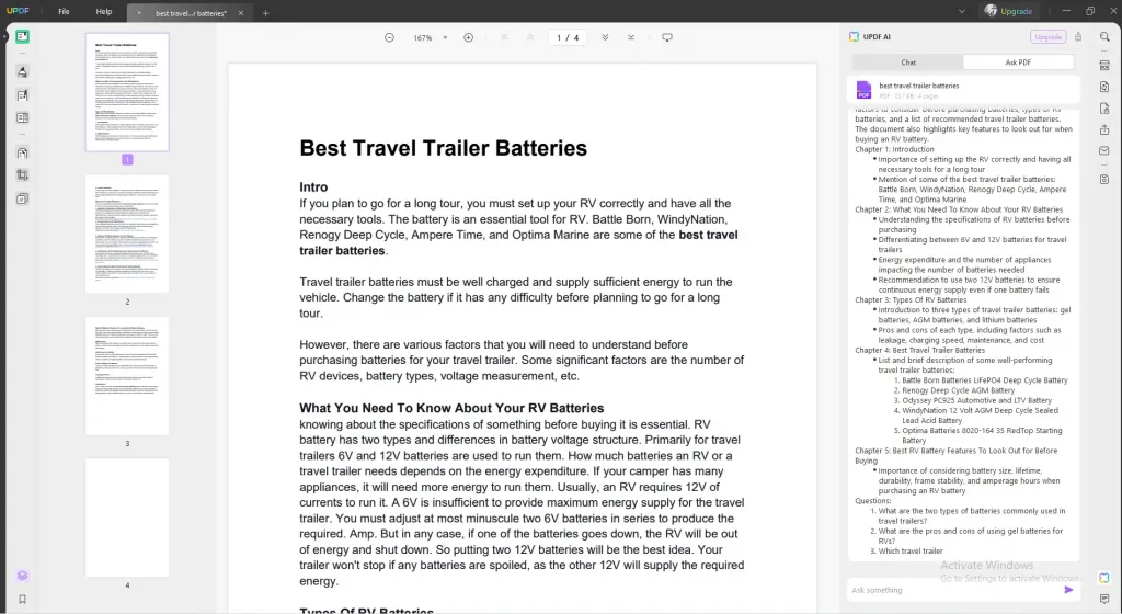 - Toca el icono UPDF y aparecerá la barra lateral AI. Pulsa el botón Pedir PDF y Empezar. Aparecerá automáticamente un resumen de tu documento.